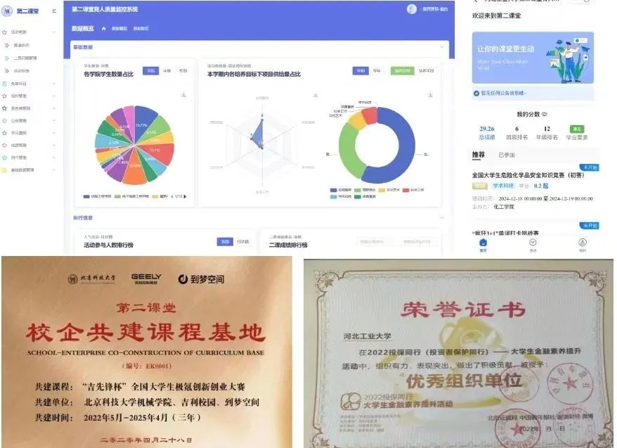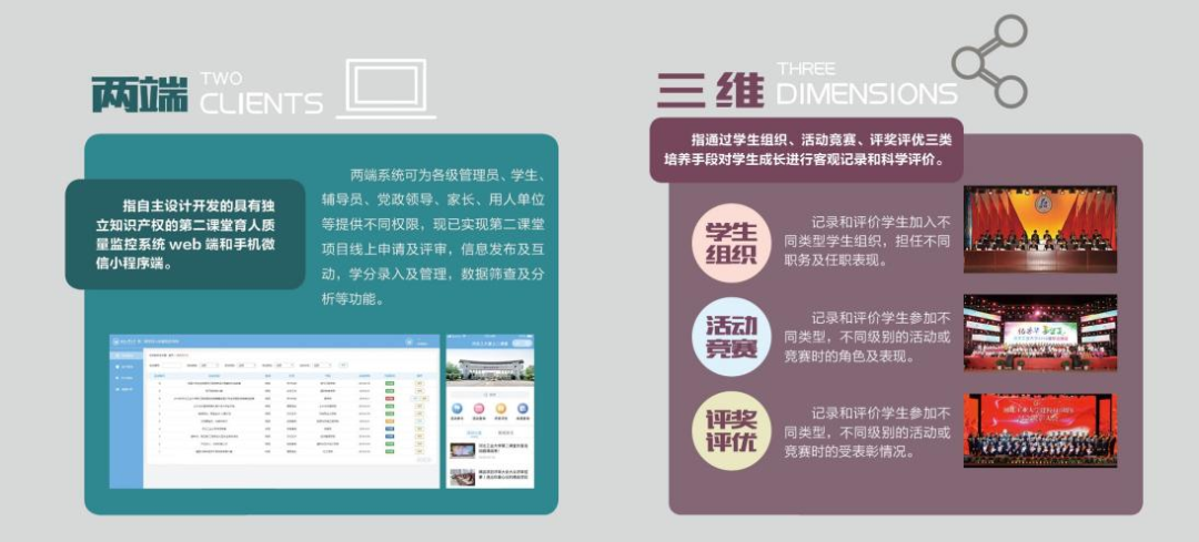 校团委迭代更新了具有自主知识产权的“第二课堂育人质量监控系统V2.0”,完成了与学校教务、学工、人事等系统数据互联互通,建立起高效便捷的数据信息体系,并已开通企业用户端口,吸引华为、腾讯、京东方、吉利等百余家企业合作项目近200项。搭建了“两端三维六面”育人体系,构建起学生参与第二课堂课程项目过程和结果的成长轨迹,最终形成科学、全面、客观的“第二课堂成绩单”,为四届2.1万名毕业生生成完整的第二课堂成绩单并纳入学生档案,助力学生求职深造就业。