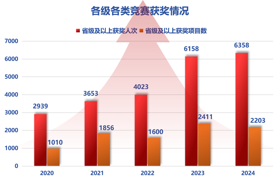 校团委聚焦科技育人成效,厚植科技创新人才培养基础,构建了“竞赛驱动、实践导向、项目培育、成果转化”的科技创新育人体系,为学校国家“双一流”建设和改革发展提供有力支撑。近五年,学校各级各类竞赛参赛人次累计达17.7万,年均增长率12.4%;省级及以上获奖人次达2.7万,年均增长率11.9%;省级及以上获奖项目数逾9000项,年均增长率28%。
