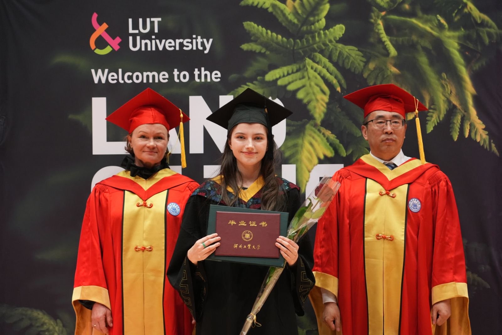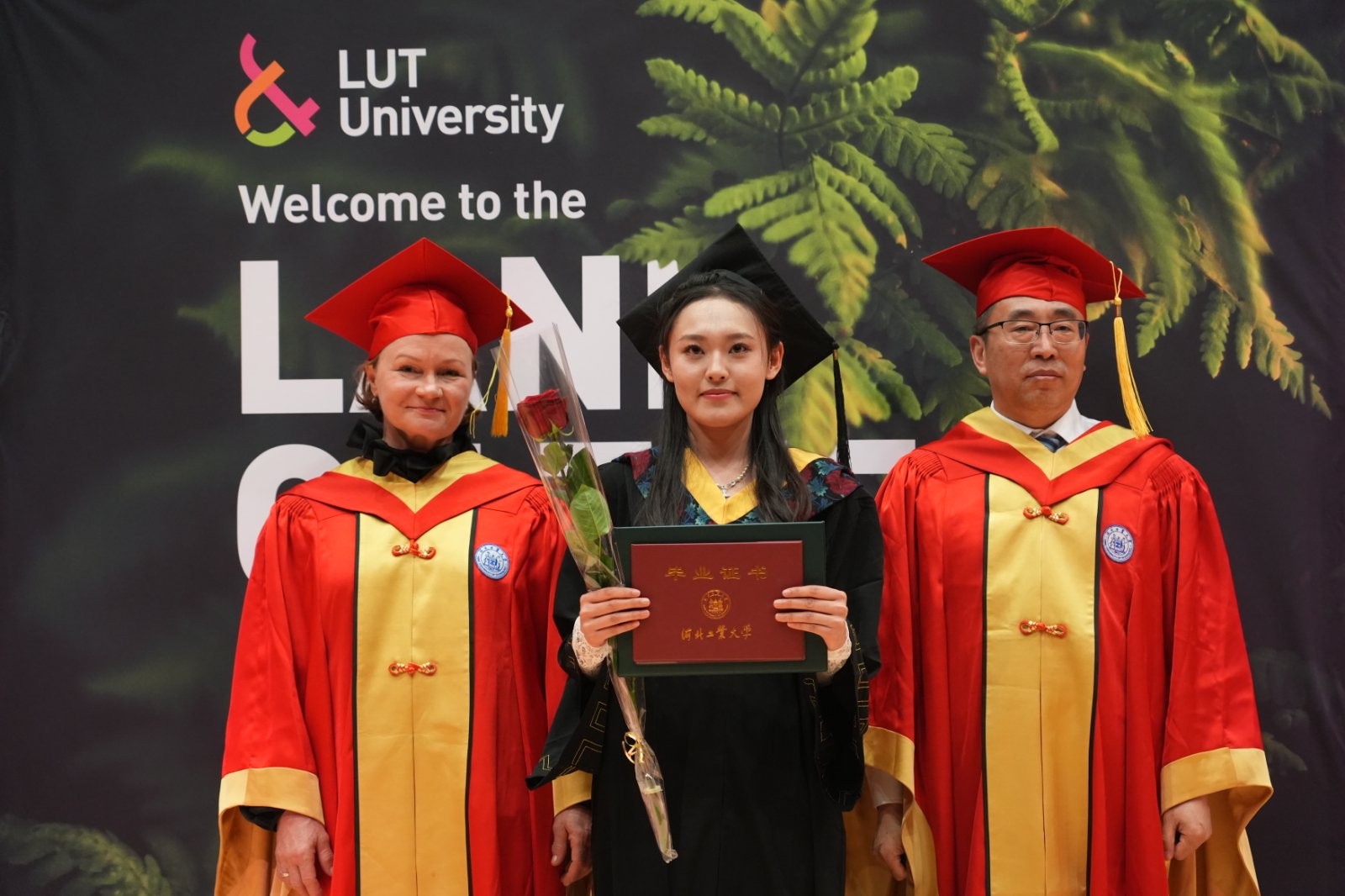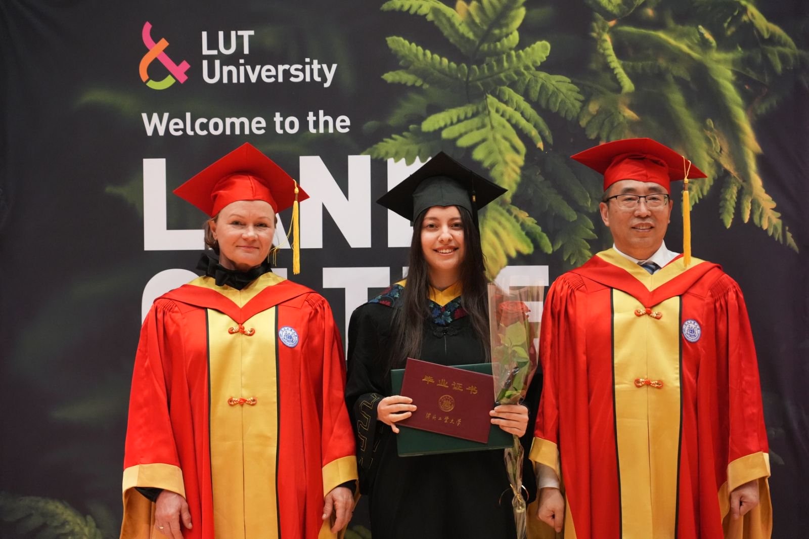 JAANASANDSTRÖM发表致辞。她高度评价了芬兰校区的办学成果,认为双方的合作模式在全球高等教育合作中具有重要的示范意义;特别赞扬了两校教职工在合作过程中展现出的开拓创新精神,并对他们为两校所作出的贡献表示衷心感谢。JAANA寄语毕业生,期望他们在未来的生活中始终保持好奇心与独立思考的科学精神,勇于探索、敢于创新,不盲从、不止步,勇敢走出属于自己的道路;能够将所学付诸实践,为推动人类福祉和全球可持续发展贡献智慧与力量;诚挚邀请毕业生加入LUT全球校友网络,继续与母校保持联系,无论身在何方,始终心系LUT,共同迎接更加美好的未来。