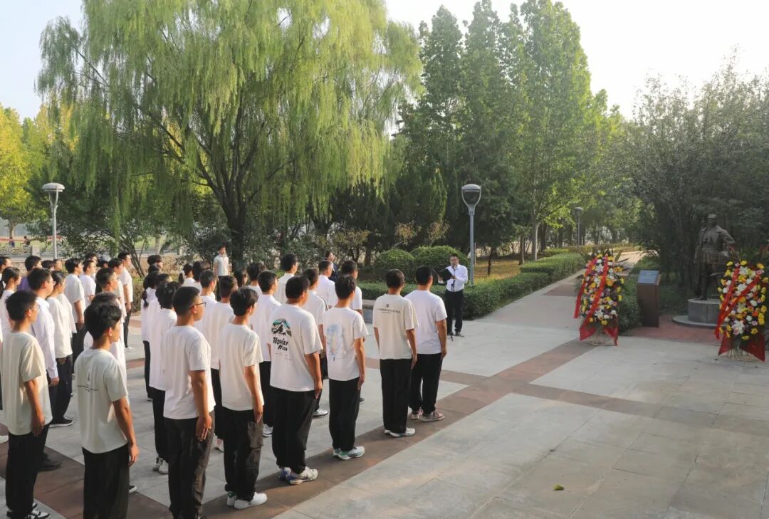在抗日英烈雕塑前,师生代表奏唱国歌,对英魂致以崇高敬意。蓝天国旗护卫队向烈士敬献花篮。