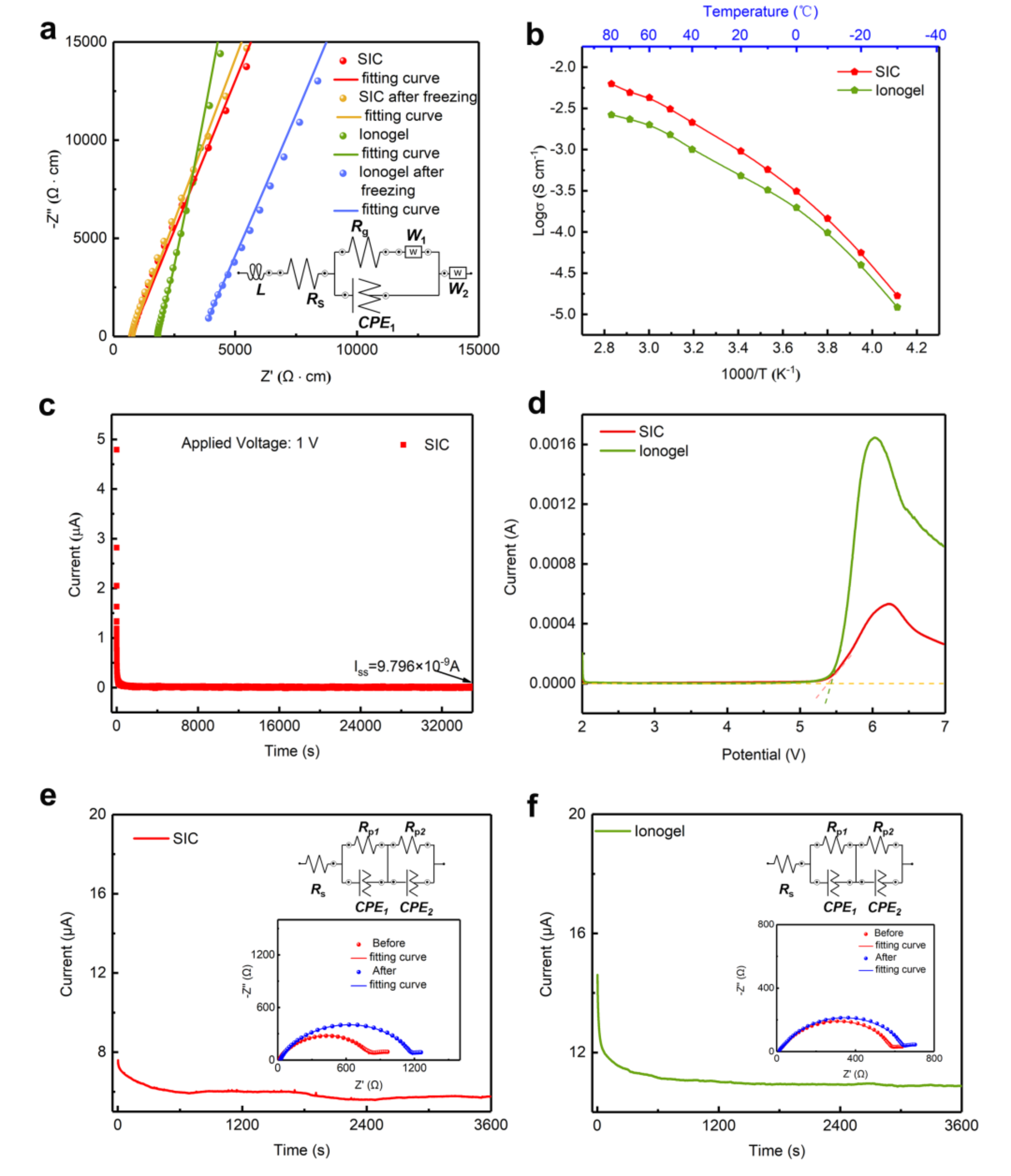 (d) SIC电解质和高浓度离子凝胶的线性扫描伏曲线.(e) SIC电解质对称电池的电流时间-曲线.(f) 高浓度离子凝胶的对称电池的电流时间-曲线.