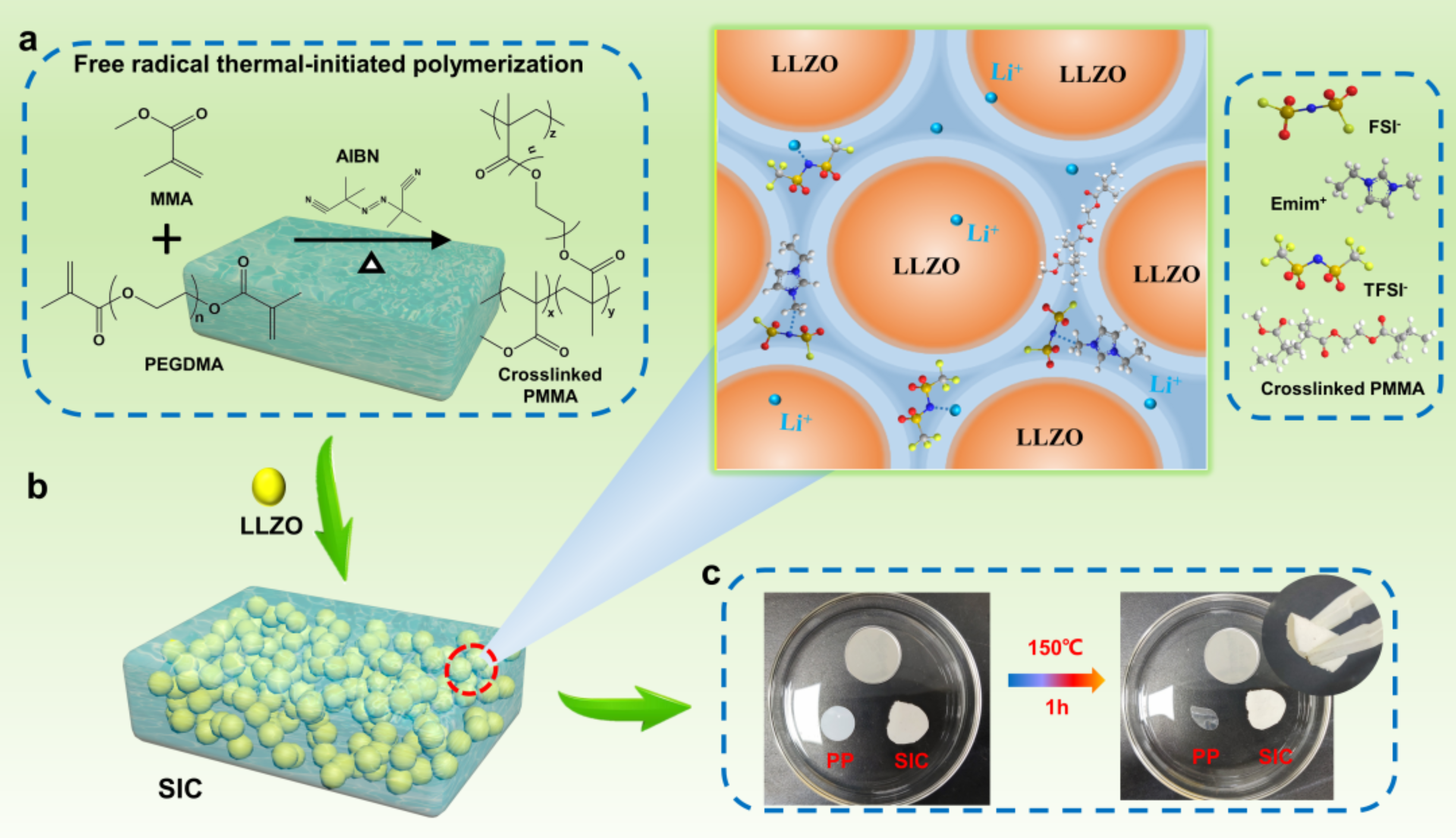 图1 (a) PMMA自由基聚合反应. (b) SIC电解质的设计示意图.(c) SIC电解质与商用PP隔膜的耐热性比较.