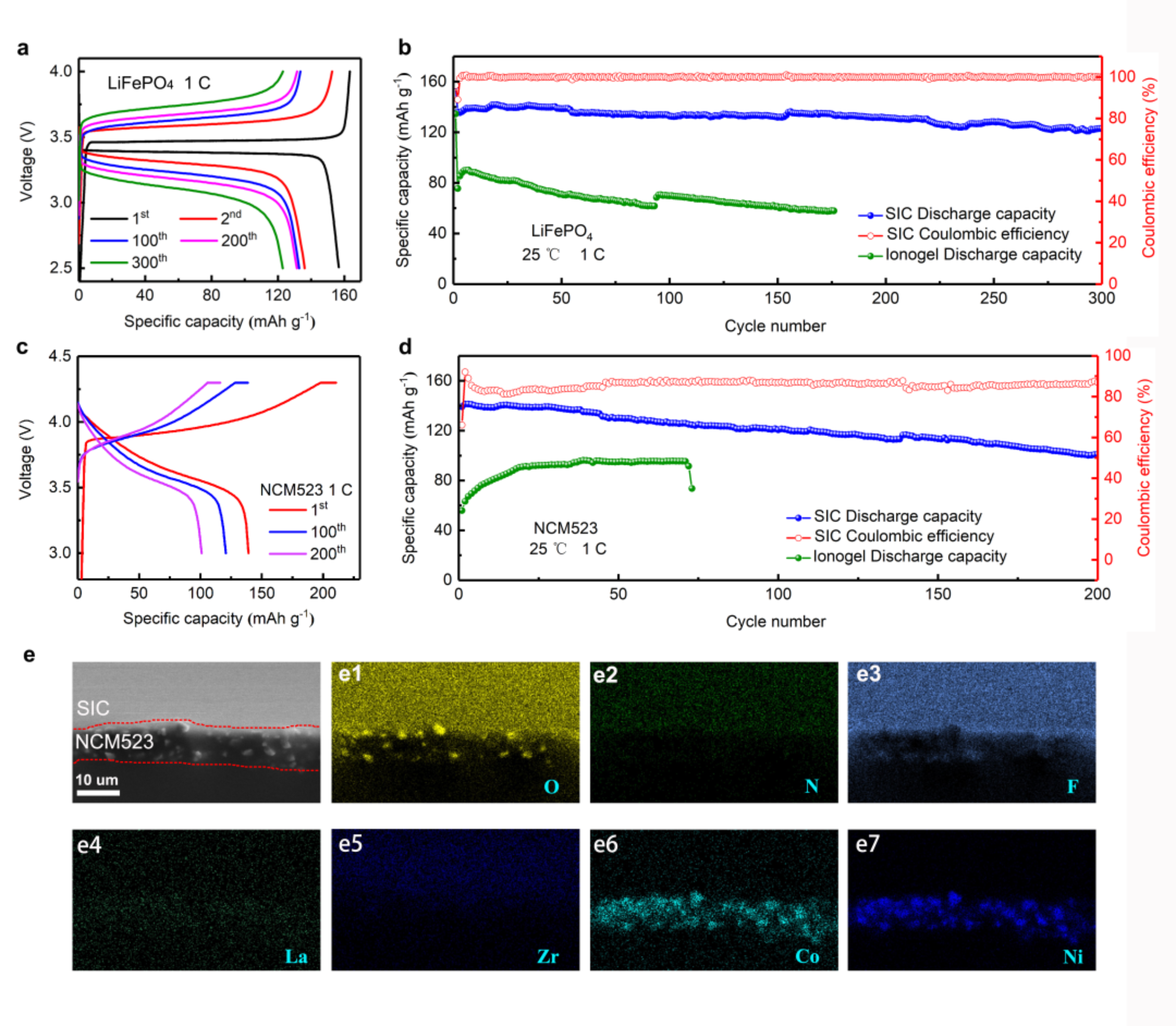 通过液相前驱体的原位聚合形成复合电解质,可以解决电解质和电极之间的高界面电阻问题。研究团队利用陶瓷和超浓缩离子凝胶的优点,包括良好的锂金属稳定性和稳定的电解质/正极截面,组装了Li‖NCM523和Li‖LiFePO4固态电池,Li‖LiFePO4电池在25℃,倍率为1C的条件下稳定工作300圈,且库伦效率接近于100%。而Li‖NCM523电池在室温和1C条件下的良好循环,表明该电解质可以与高压(4.3V)正极材料相匹配。且从SEM图可以看出SIC电解质与NCM523紧密结合在一起,从N和F的EDS图中可以看出,离子凝胶浸润在正极材料内部,从而导致低的界面电阻。因此,这种“陶瓷中高浓度离子凝胶”固态电解质为高安全、高能量密度锂金属电池提供了一条新的途径。