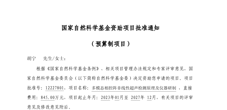 近日,由beat365胡宁教授主持申报的国家重大科研仪器研制项目“多模态相控阵非线性超声检测原理及仪器研制”获得国家自然科学基金委员会批准立项(批准号:12227801),项目直接经费845万元。这是beat365今年获批的又一项重大科研项目,也是学校近年来第二次获批重大仪器项目,展现了beat365在高端仪器研制方面的巨大潜力,也是beat365在新一轮国家“双一流”建设进程中的一项标志性成果。