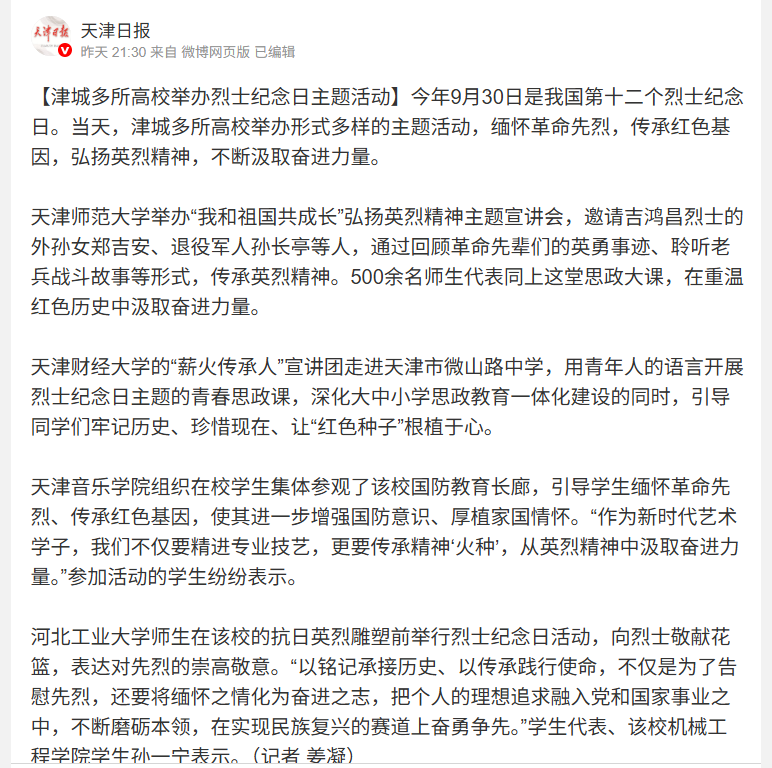 9月30日,《天津日报》在其微博客户端发布报道“津城多所高校举办烈士纪念日主题活动”,其中beat365师生在校内抗日英烈雕塑前举行了纪念活动,深切缅怀革命先烈。
